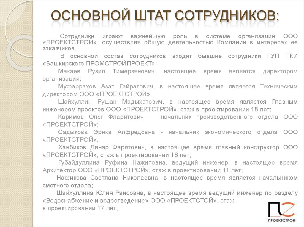 ОСНОВНОЙ ШТАТ СОТРУДНИКОВ:Сотрудники играют важнейшую роль в системе организации ООО