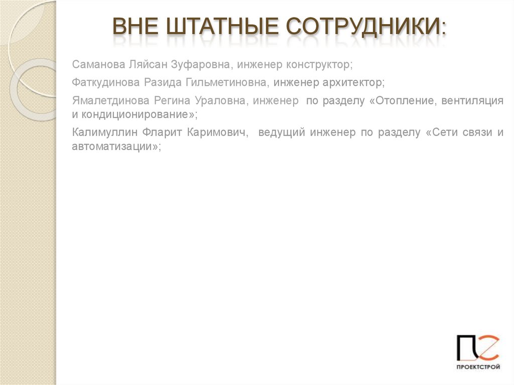 ВНЕ ШТАТНЫЕ СОТРУДНИКИ:Саманова Ляйсан Зуфаровна, инженер конструктор;