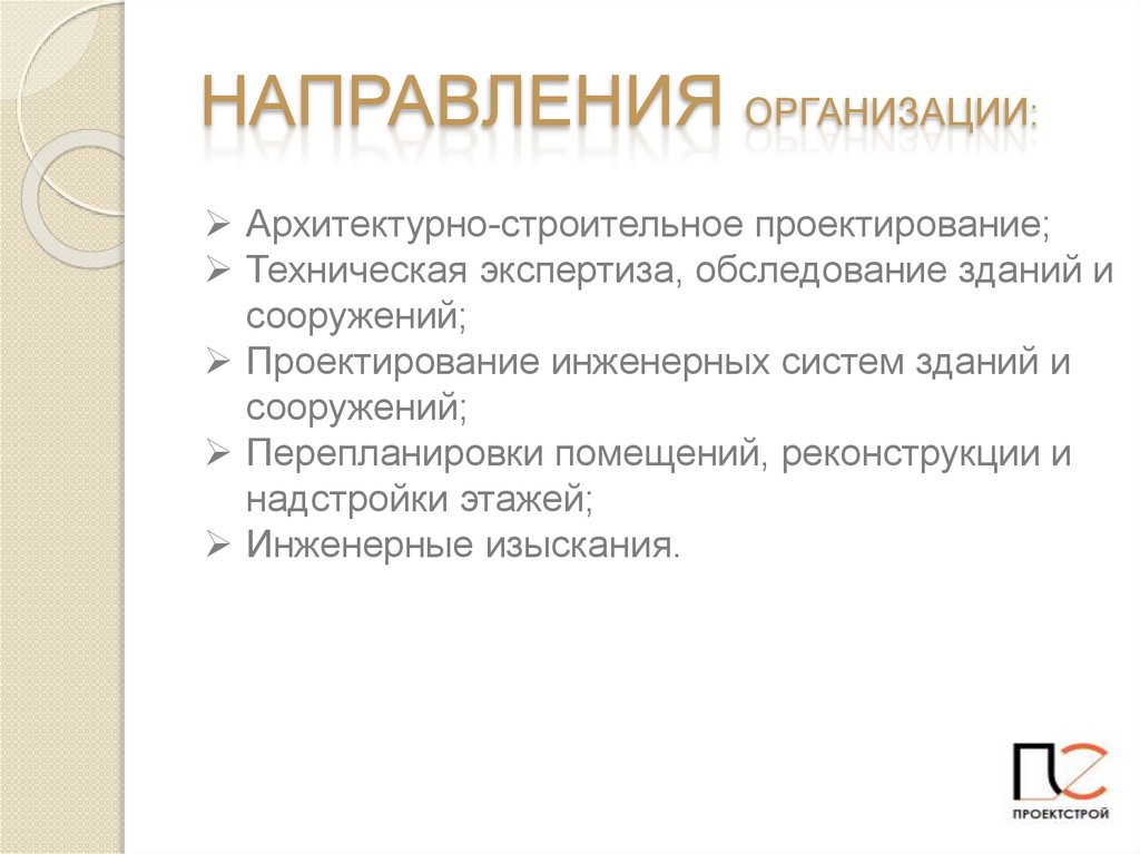 НАПРАВЛЕНИЯ ОРГАНИЗАЦИИ:Архитектурно-строительное проектирование;