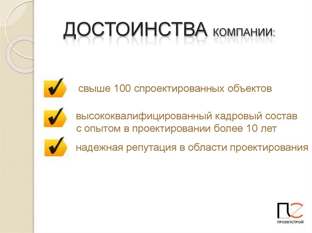 ДОСТОИНСТВА КОМПАНИИ:свыше 100 спроектированных объектов