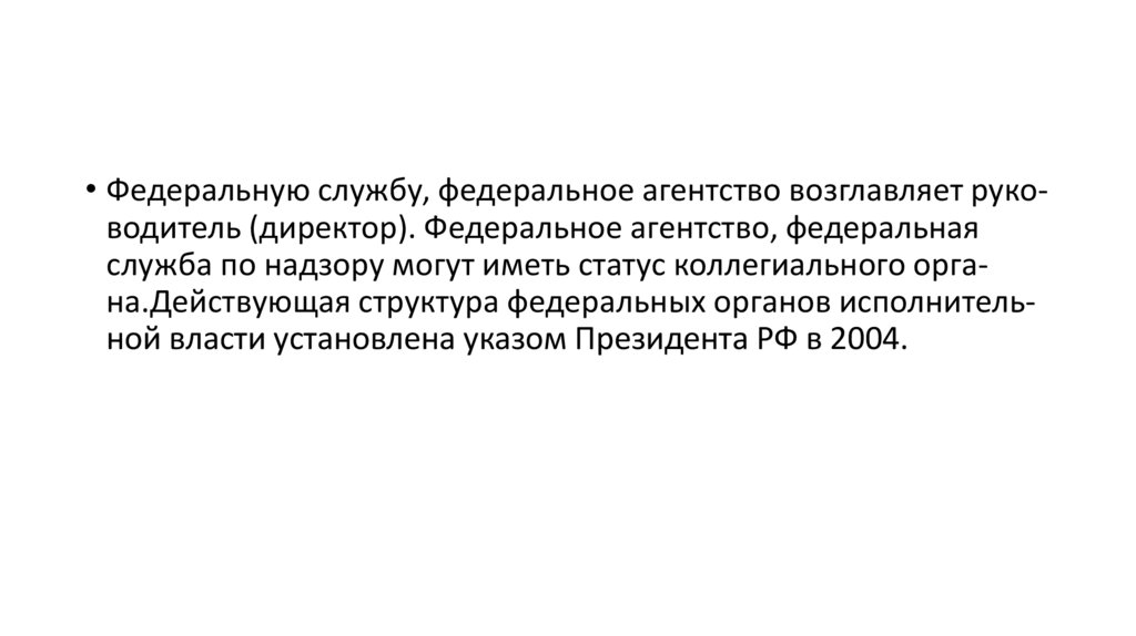 • Федеральную службу, федеральное агентство возглавляет руководитель (директор). Федеральное агентство, федеральнаяслужба по надзору могут иметь статус коллегиального органа.Действующая структура федеральных органов исполнительной власти установлена указом Президента РФ в 2004.