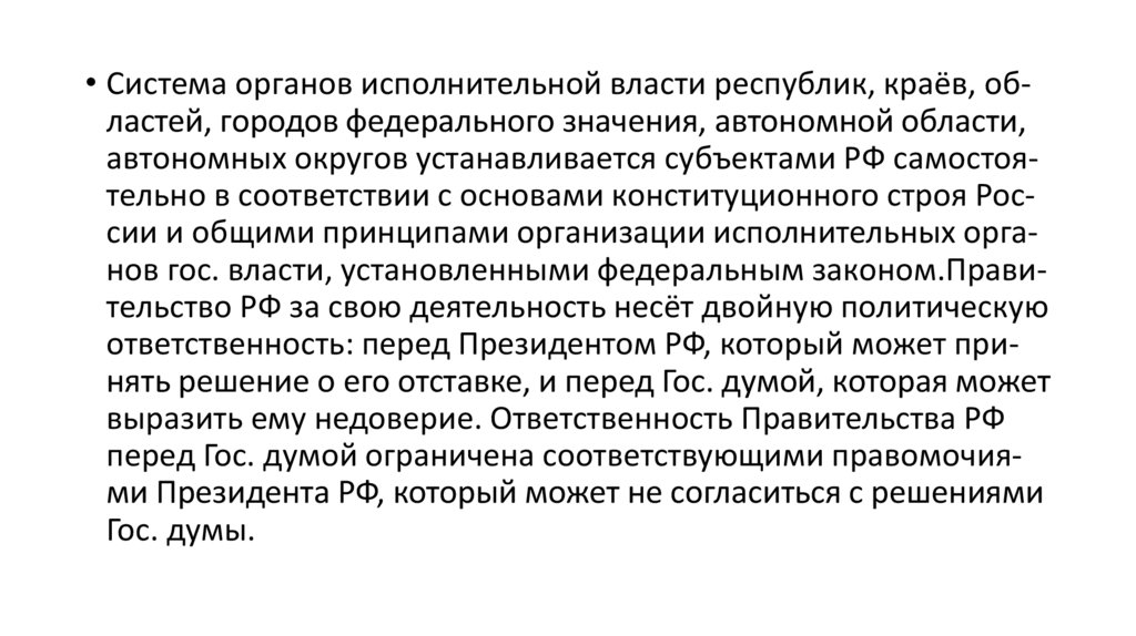 • Система органов исполнительной власти республик, краёв, областей, городов федерального значения, автономной области,автономных округов устанавливается субъектами РФ самостоятельно в соответствии с основами конституционного строя России и общими принципами организации исполнительных органов гос. власти, установленными федеральным законом.Правительство РФ за свою деятельность несёт двойную политическую