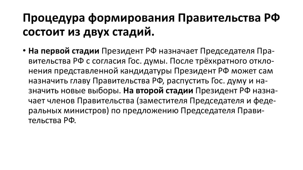 • На первой стадии Президент РФ назначает Председателя Правительства РФ с согласия Гос. думы. После трёхкратного отклонения представленной кандидатуры Президент РФ может сам