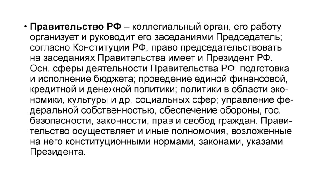 • Правительство РФ – коллегиальный орган, его работуорганизует и руководит его заседаниями Председатель;