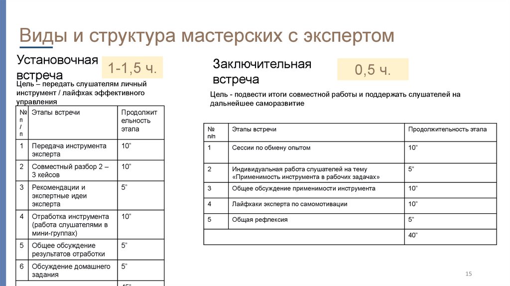 Виды и структура мастерских с экспертомУстановочная