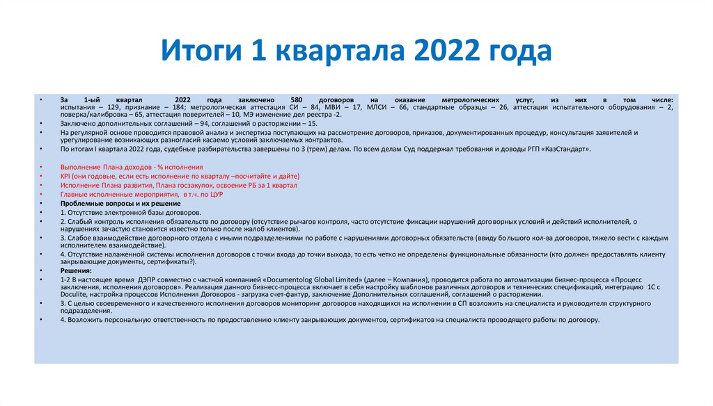 По итогам I квартала 2022 года, судебные разбирательства завершены по 3 (трем) делам. По всем делам Суд поддержал требования и доводы РГП «КазСтандарт».