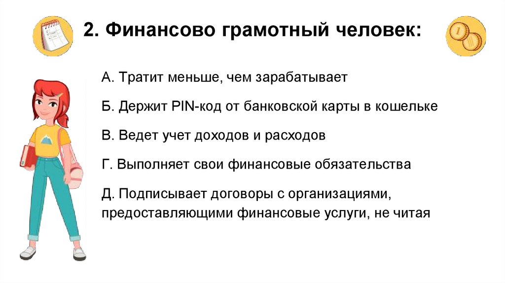 2. Финансово грамотный человек:А. Тратит меньше, чем зарабатывает