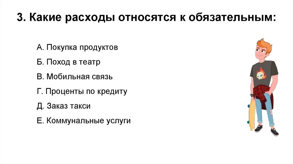 3. Какие расходы относятся к обязательным:А. Покупка продуктов