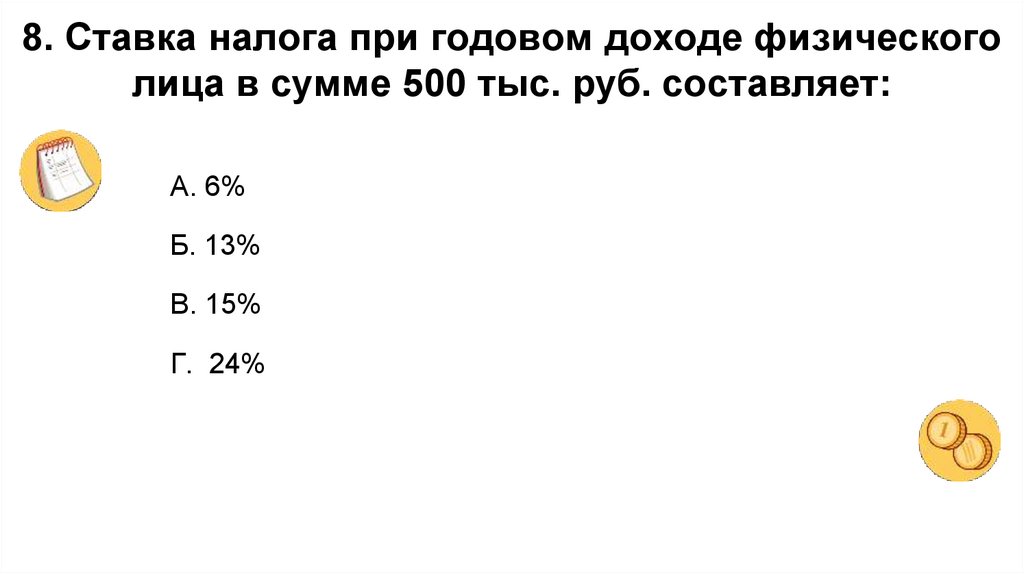 8. Ставка налога при годовом доходе физическоголица в сумме 500 тыс. руб. составляет: