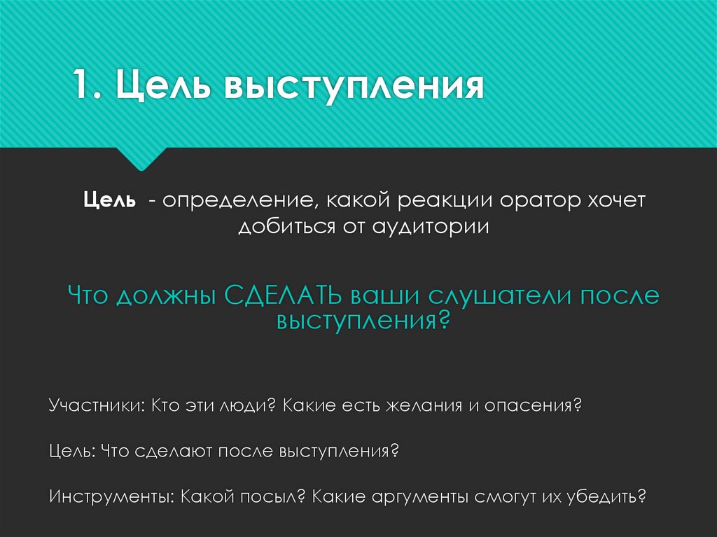 1. Цель выступленияЦель - определение, какой реакции оратор хочет