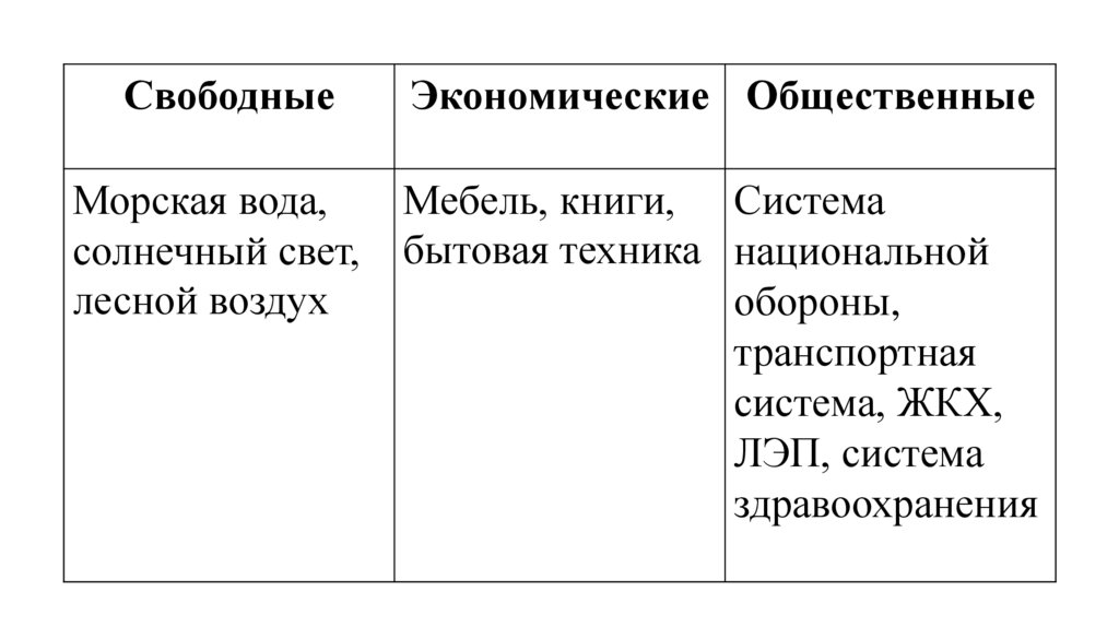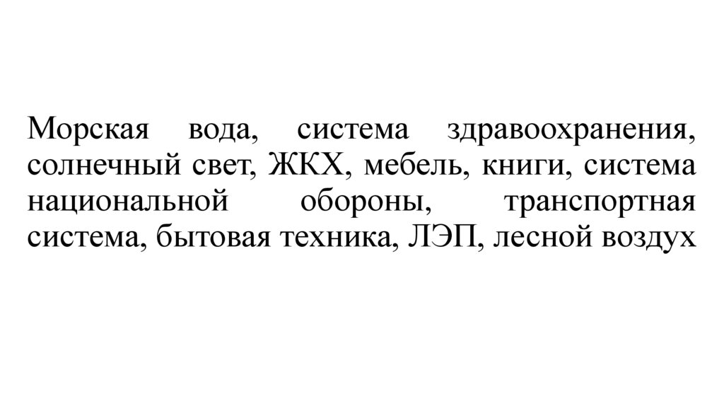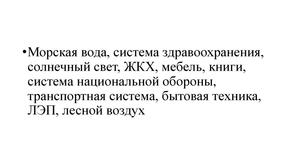 •Морская вода, система здравоохранения,солнечный свет, ЖКХ, мебель, книги,