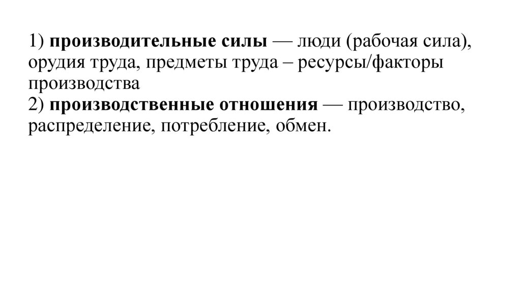 1) производительные силы — люди (рабочая сила),орудия труда, предметы труда – ресурсы/факторы