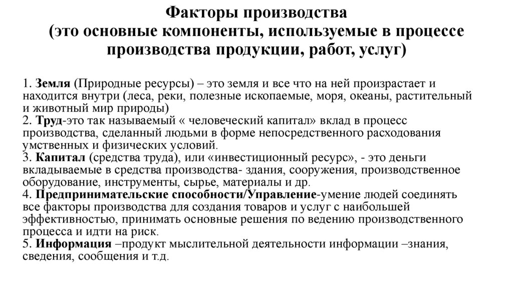 Факторы производства(это основные компоненты, используемые в процессе