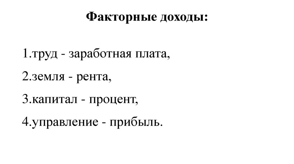 Факторные доходы:1.труд - заработная плата,
