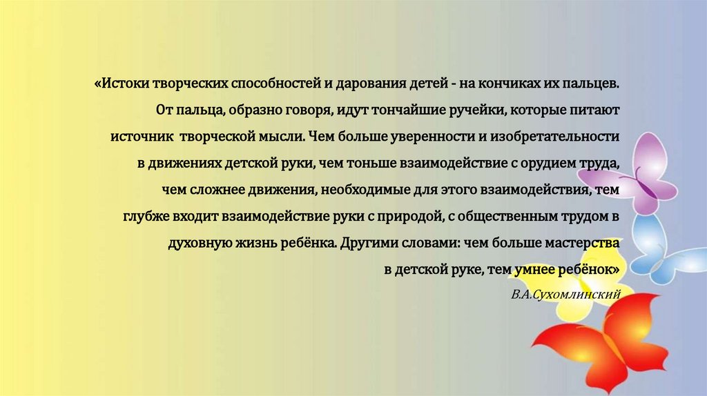 «Истоки творческих способностей и дарования детей - на кончиках их пальцев.От пальца, образно говоря, идут тончайшие ручейки, которые питают