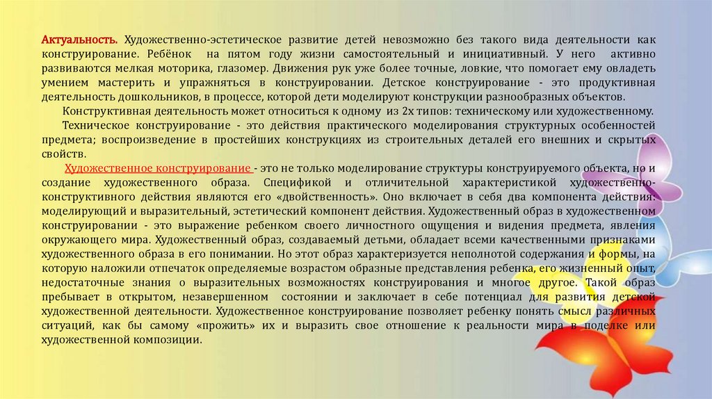 Актуальность. Художественно-эстетическое развитие детей невозможно без такого вида деятельности какконструирование. Ребёнок на пятом году жизни самостоятельный и инициативный. У него активно