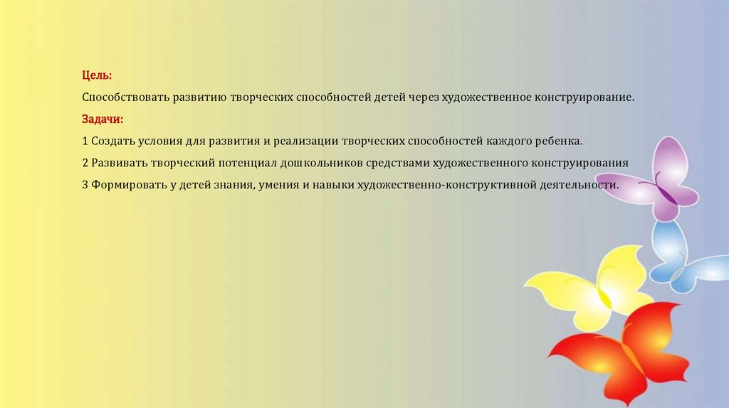 Цель:Способствовать развитию творческих способностей детей через художественное конструирование.