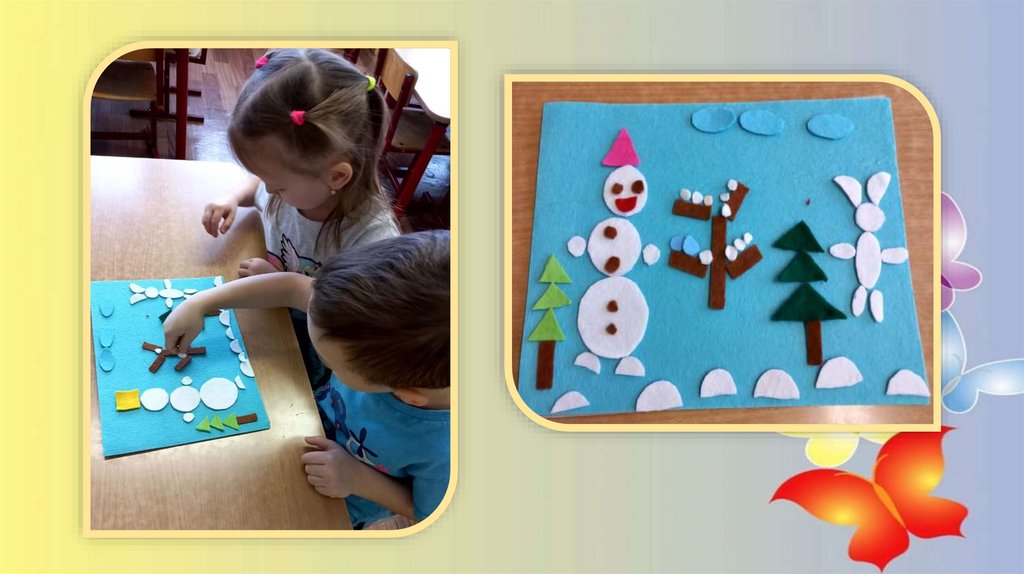 Дети самостоятельно выбирают из общего количества деталей нужные длякомпозиции элементы определённой формы, цвета, величины. В композиции дети