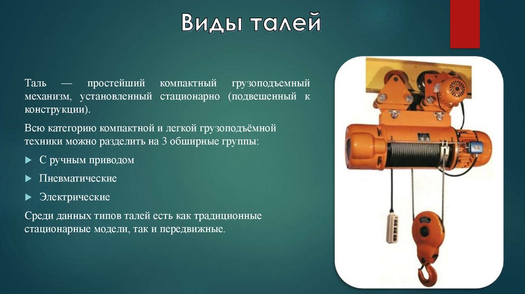 Таль — простейший компактный грузоподъемныймеханизм, установленный стационарно (подвешенный к