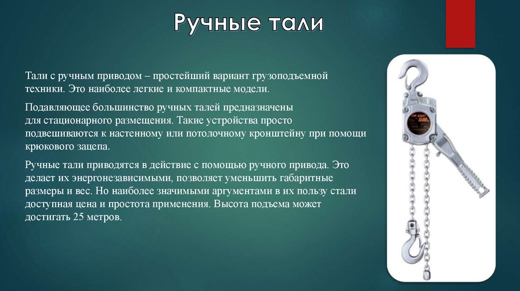 Тали с ручным приводом – простейший вариант грузоподъемнойтехники. Это наиболее легкие и компактные модели.