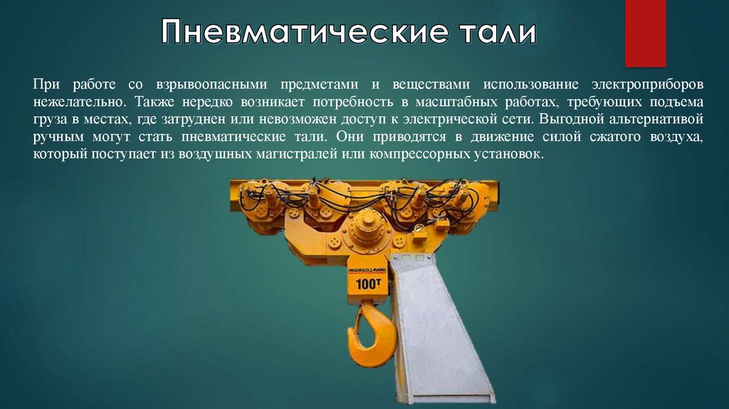 ручным могут стать пневматические тали. Они приводятся в движение силой сжатого воздуха,