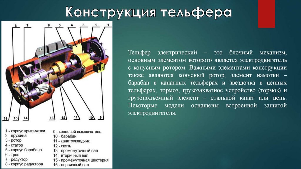 Тельфер электрический – это блочный механизм,основным элементом которого является электродвигатель