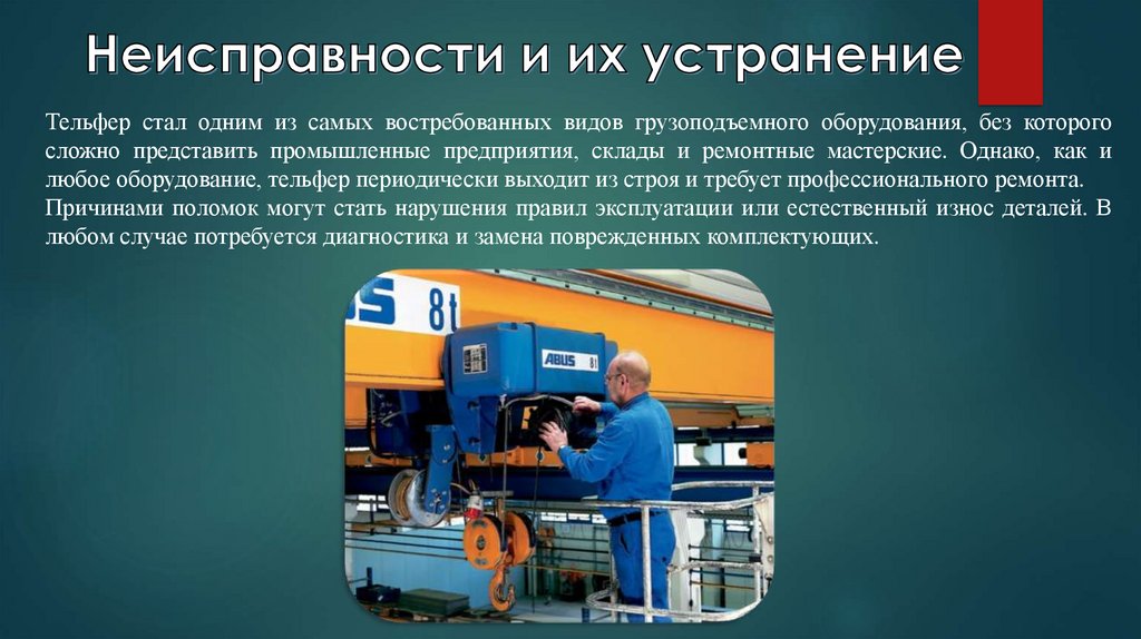 любое оборудование, тельфер периодически выходит из строя и требует профессионального ремонта.