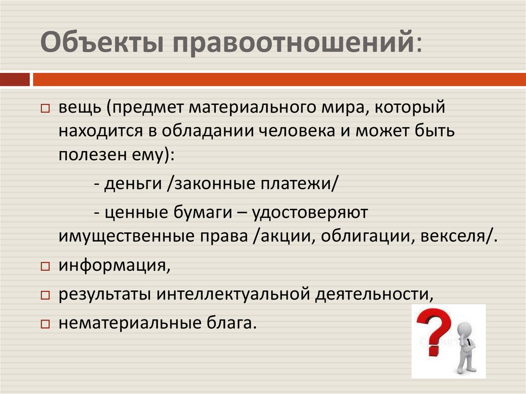 Объекты правоотношений:вещь (предмет материального мира, который
