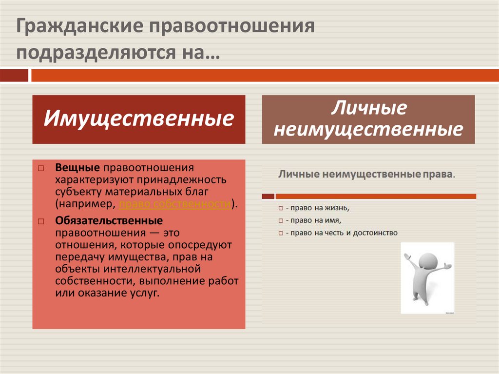 Гражданские правоотношенияподразделяются на…