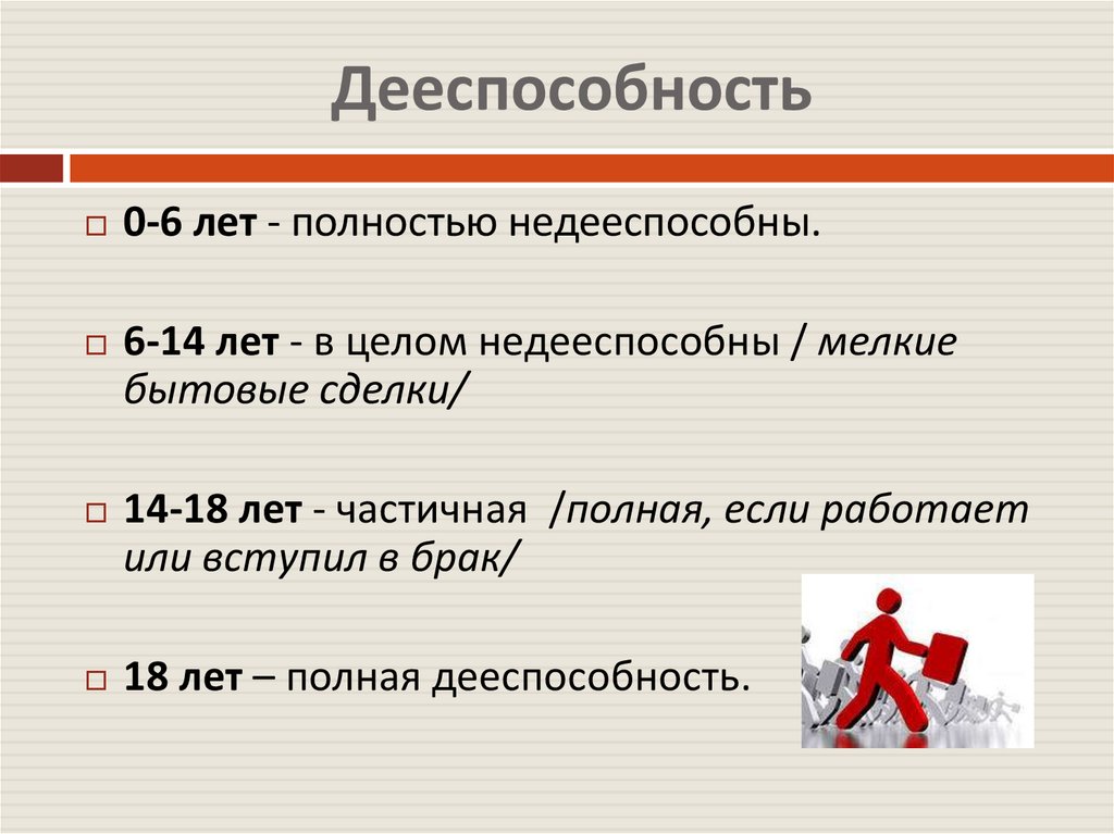 Дееспособность0-6 лет - полностью недееспособны.