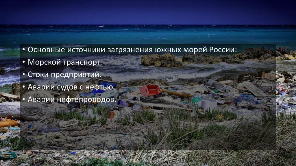 • Основные источники загрязнения южных морей России:• Морской транспорт.