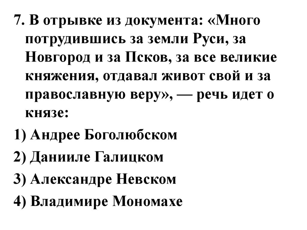 7. В отрывке из документа: «Многопотрудившись за земли Руси, за