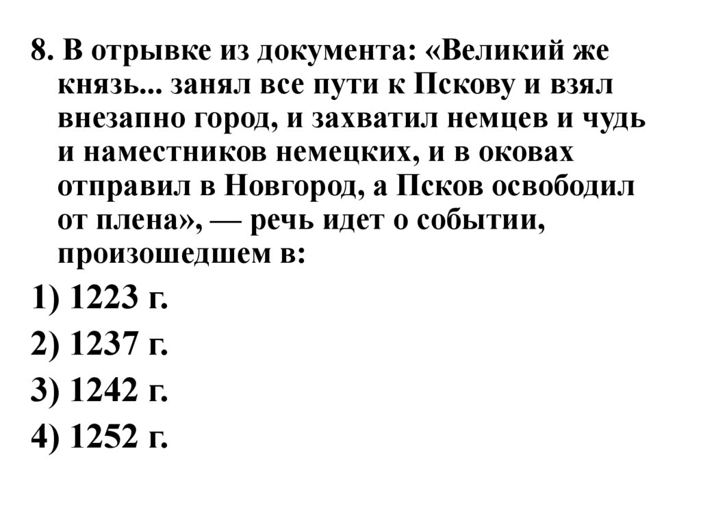 8. В отрывке из документа: «Великий жекнязь... занял все пути к Пскову и взял