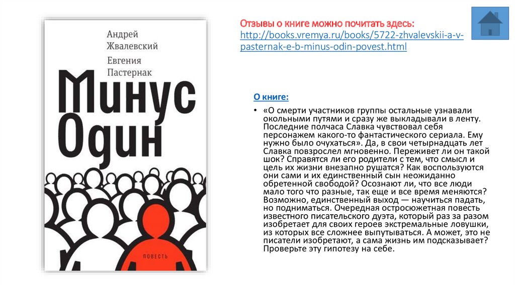 Отзывы о книге можно почитать здесь:http://books.vremya.ru/books/5722-zhvalevskii-a-vpasternak-e-b-minus-odin-povest.html