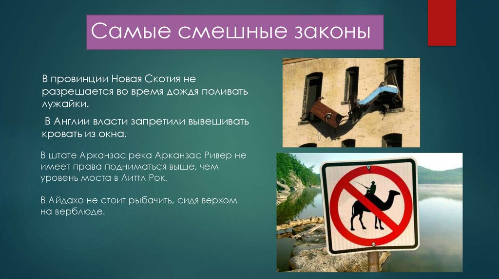 Странный закон из города Пенсакала. Женщина, которая погибла изза неосторожного использования электроприбора в ванной, обязаназаплатить штраф в размере 100 долларов.