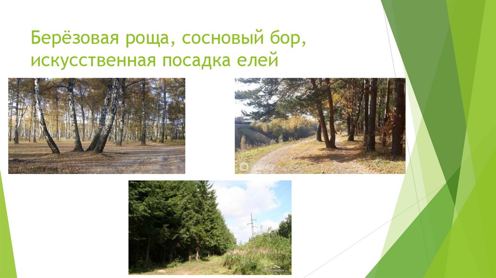 Берёзовая роща, сосновый бор,искусственная посадка елей