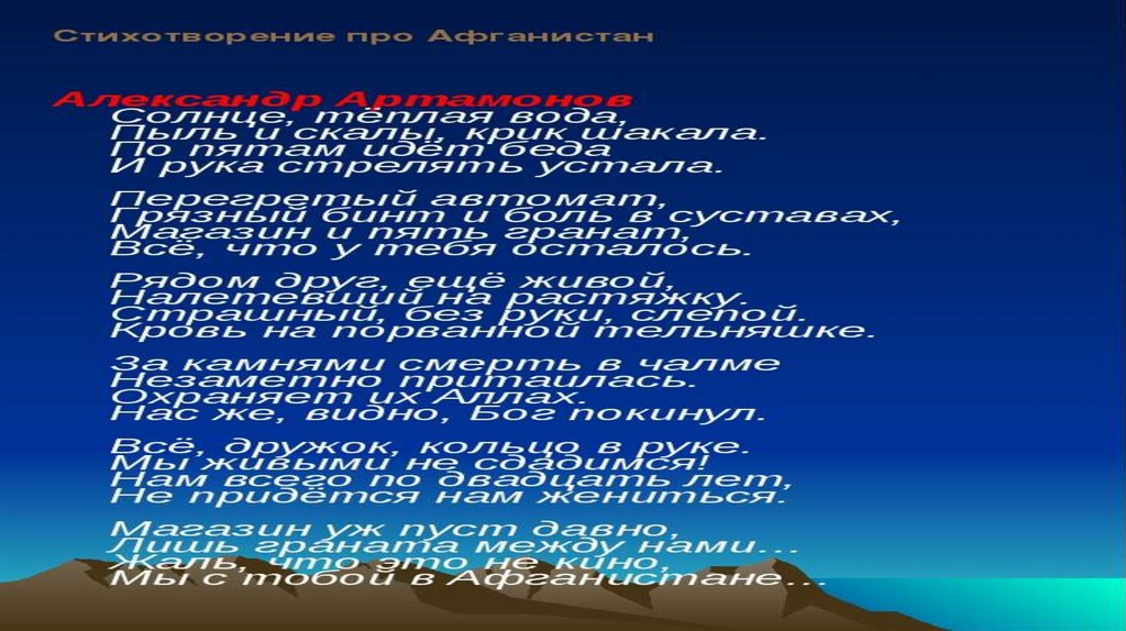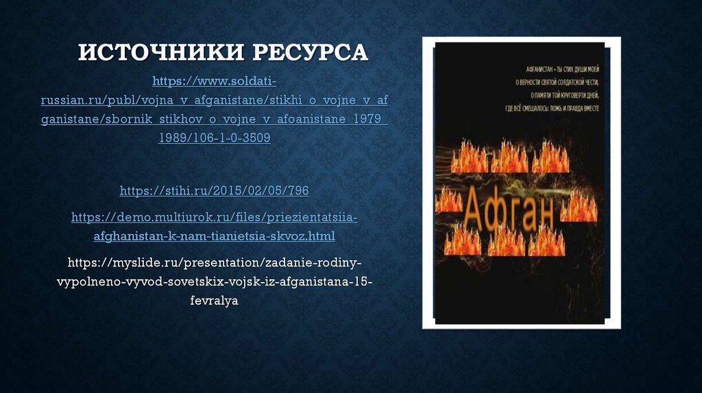 ИСТОЧНИКИ РЕСУРСАhttps://www.soldatirussian.ru/publ/vojna_v_afganistane/stikhi_o_vojne_v_af