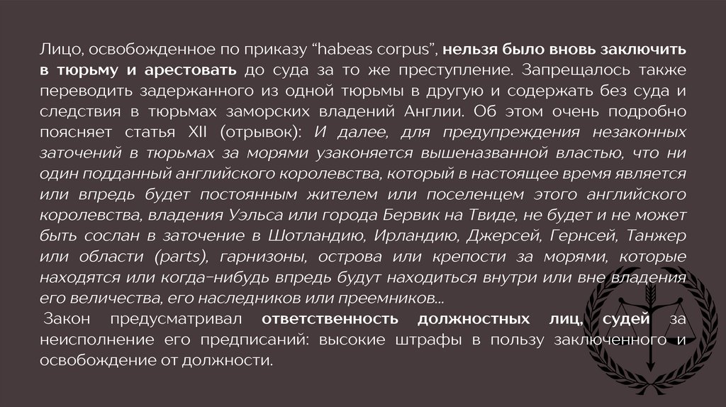 Лицо, освобожденное по приказу “habeas corpus”, нельзя было вновь заключитьв тюрьму и арестовать до суда за то же преступление. Запрещалось также