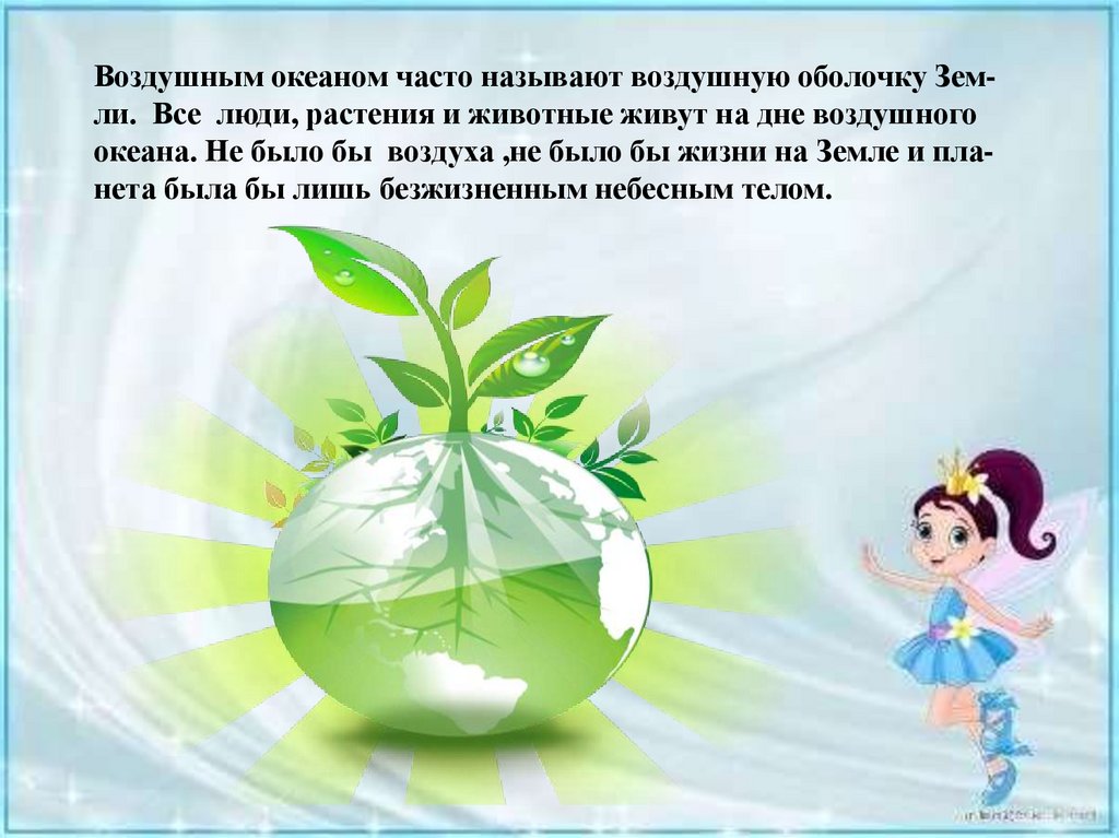 Воздушным океаном часто называют воздушную оболочку Земли. Все люди, растения и животные живут на дне воздушногоокеана. Не было бы воздуха ,не было бы жизни на Земле и планета была бы лишь безжизненным небесным телом.