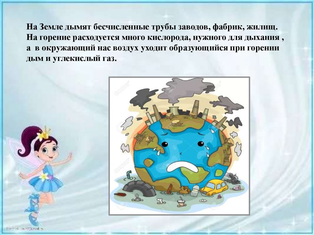 На Земле дымят бесчисленные трубы заводов, фабрик, жилищ.На горение расходуется много кислорода, нужного для дыхания ,