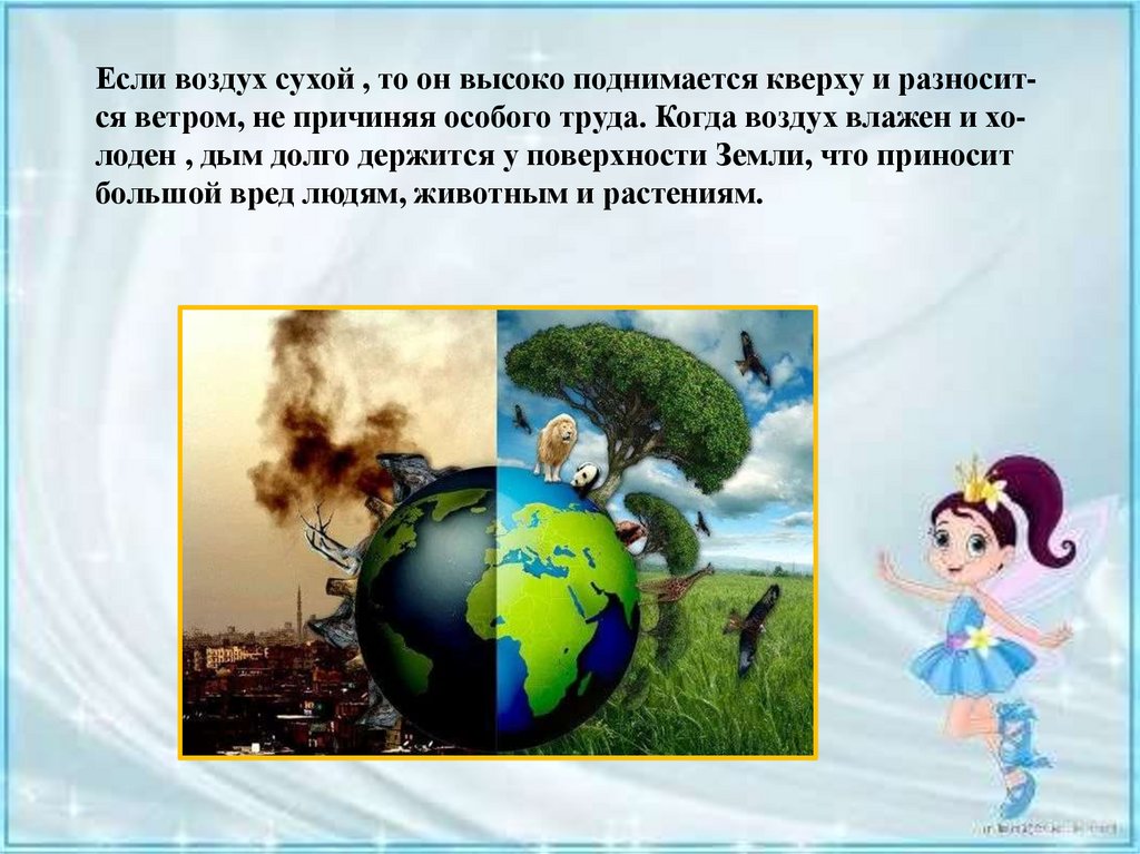 Если воздух сухой , то он высоко поднимается кверху и разносится ветром, не причиняя особого труда. Когда воздух влажен и холоден , дым долго держится у поверхности Земли, что приноситбольшой вред людям, животным и растениям.