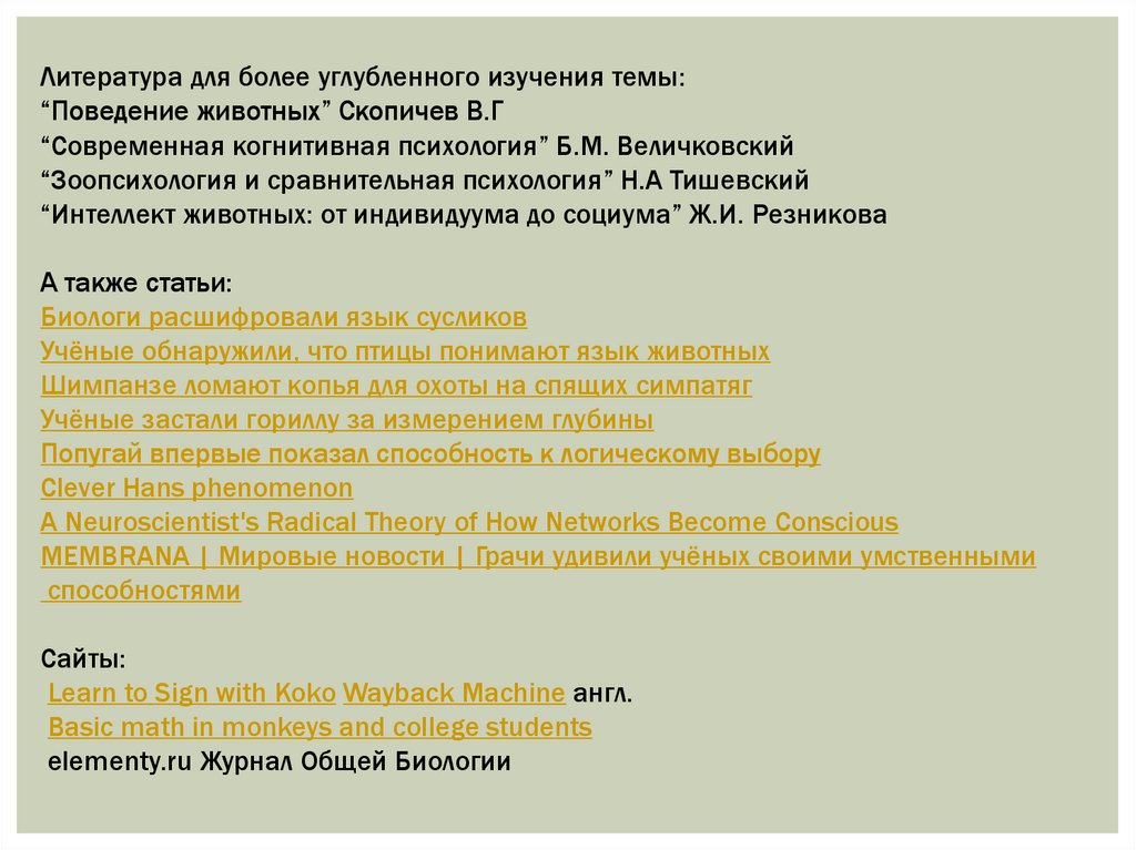 Литература для более углубленного изучения темы:“Поведение животных” Скопичев В.Г