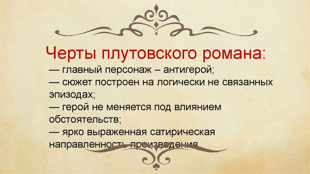 Черты плутовского романа:— главный персонаж – антигерой;
