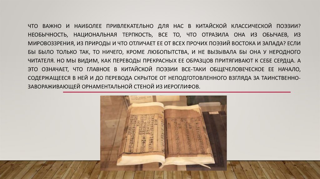 ЧТО ВАЖНО И НАИБОЛЕЕ ПРИВЛЕКАТЕЛЬНО ДЛЯ НАС В КИТАЙСКОЙ КЛАССИЧЕСКОЙ ПОЭЗИИ?НЕОБЫЧНОСТЬ, НАЦИОНАЛЬНАЯ ТЕРПКОСТЬ, ВСЕ ТО, ЧТО ОТРАЗИЛА ОНА ИЗ ОБЫЧАЕВ, ИЗ
