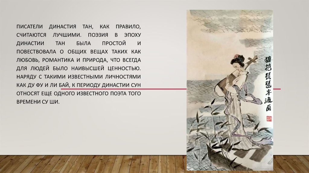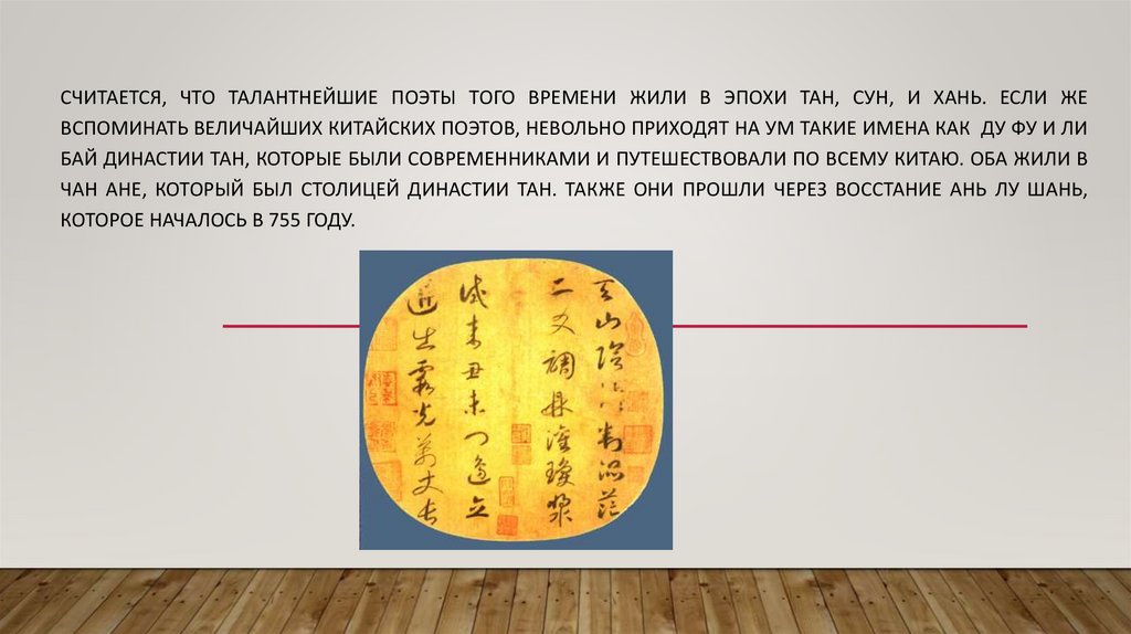 СЧИТАЕТСЯ, ЧТО ТАЛАНТНЕЙШИЕ ПОЭТЫ ТОГО ВРЕМЕНИ ЖИЛИ В ЭПОХИ ТАН, СУН, И ХАНЬ. ЕСЛИ ЖЕВСПОМИНАТЬ ВЕЛИЧАЙШИХ КИТАЙСКИХ ПОЭТОВ, НЕВОЛЬНО ПРИХОДЯТ НА УМ ТАКИЕ ИМЕНА КАК ДУ ФУ И ЛИ