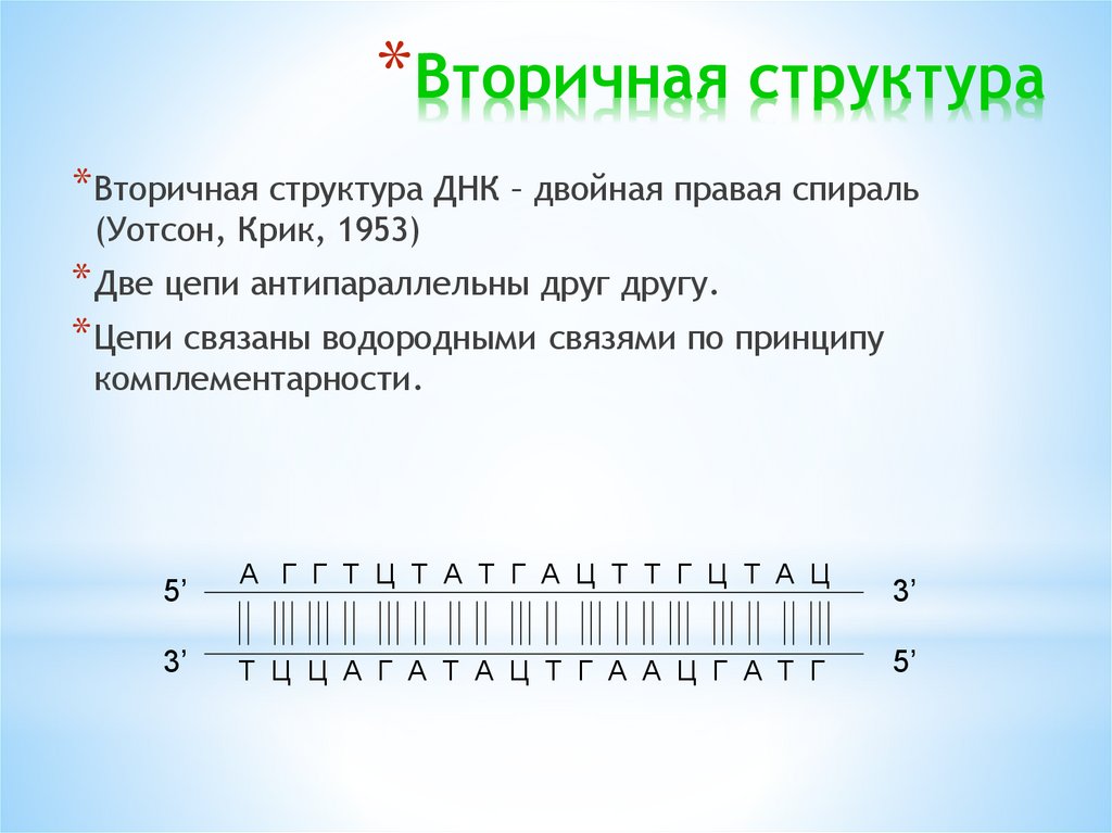 *Вторичная структура* Вторичная структура ДНК – двойная правая спираль
