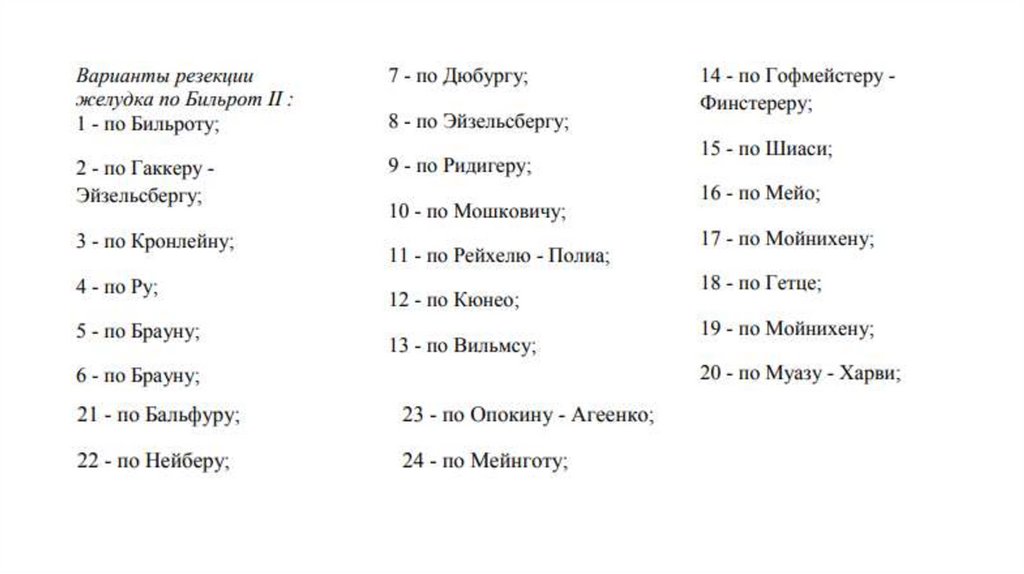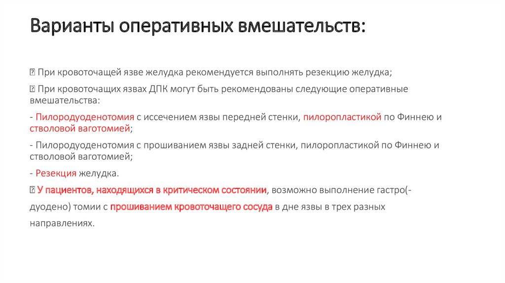 Варианты оперативных вмешательств:При кровоточащей язве желудка рекомендуется выполнять резекцию желудка;