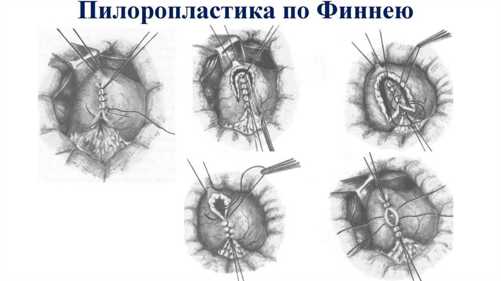 - Пилородуоденотомия с прошиванием язвы задней стенки, пилоропластикой по Финнею и