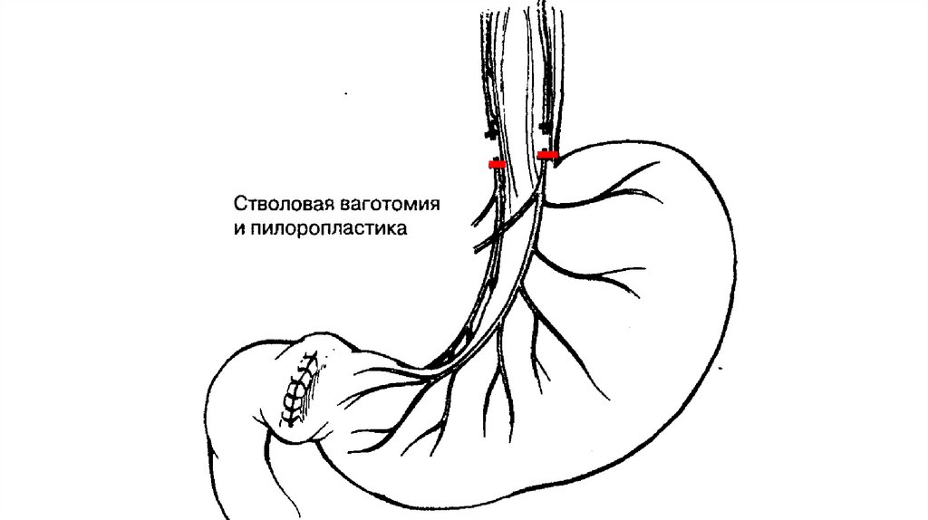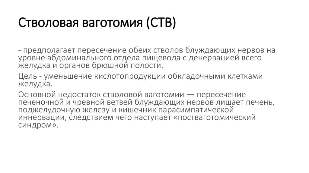 Стволовая ваготомия (СТВ)- предполагает пересечение обеих стволов блуждающих нервов на