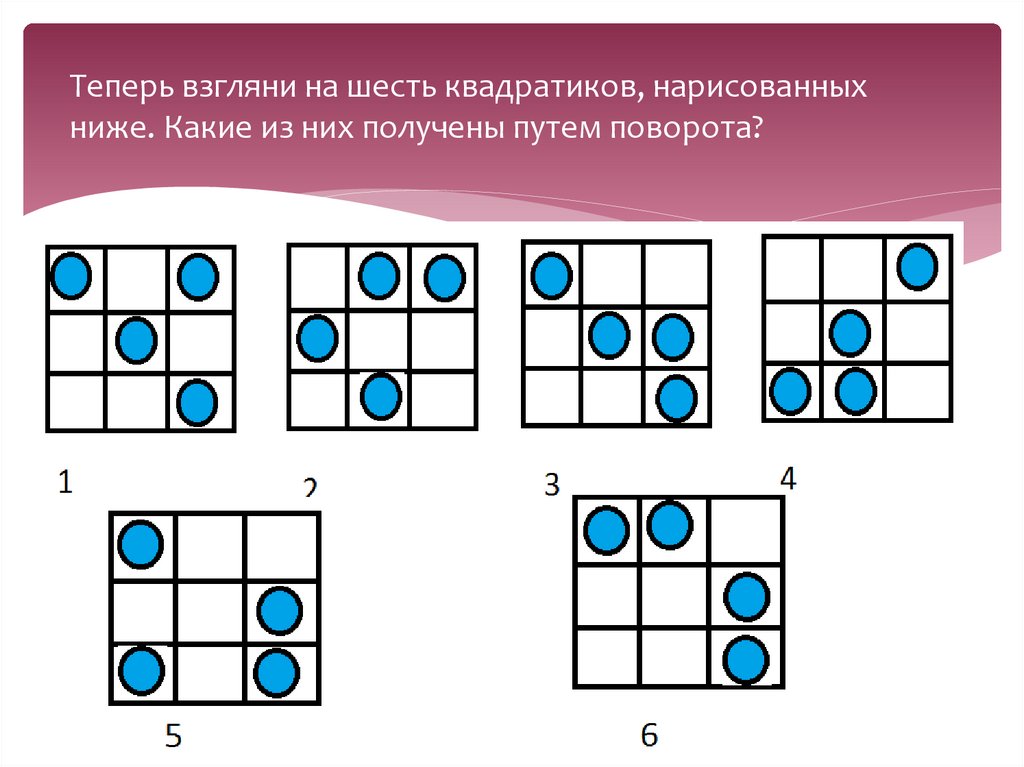 Теперь взгляни на шесть квадратиков, нарисованныхниже. Какие из них получены путем поворота?